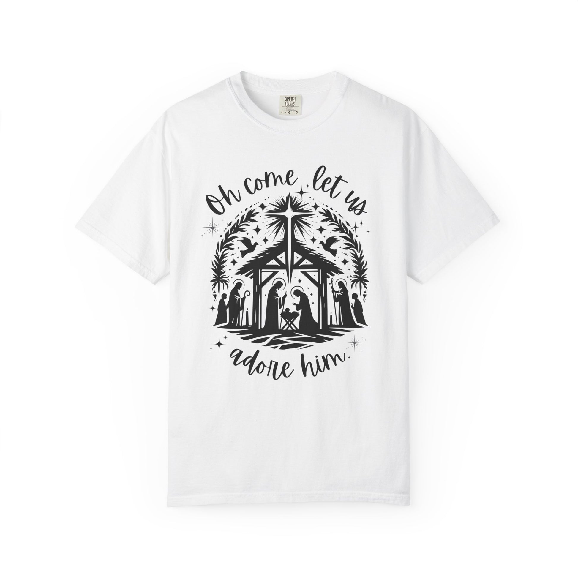 Worship in style this Christmas season with our Oh Come Let Us Adore Him tee, a beautiful reminder of the night our Savior was born. Featuring a peaceful nativity design framed by stars and palms, this shirt captures the true spirit of adoration and awe.