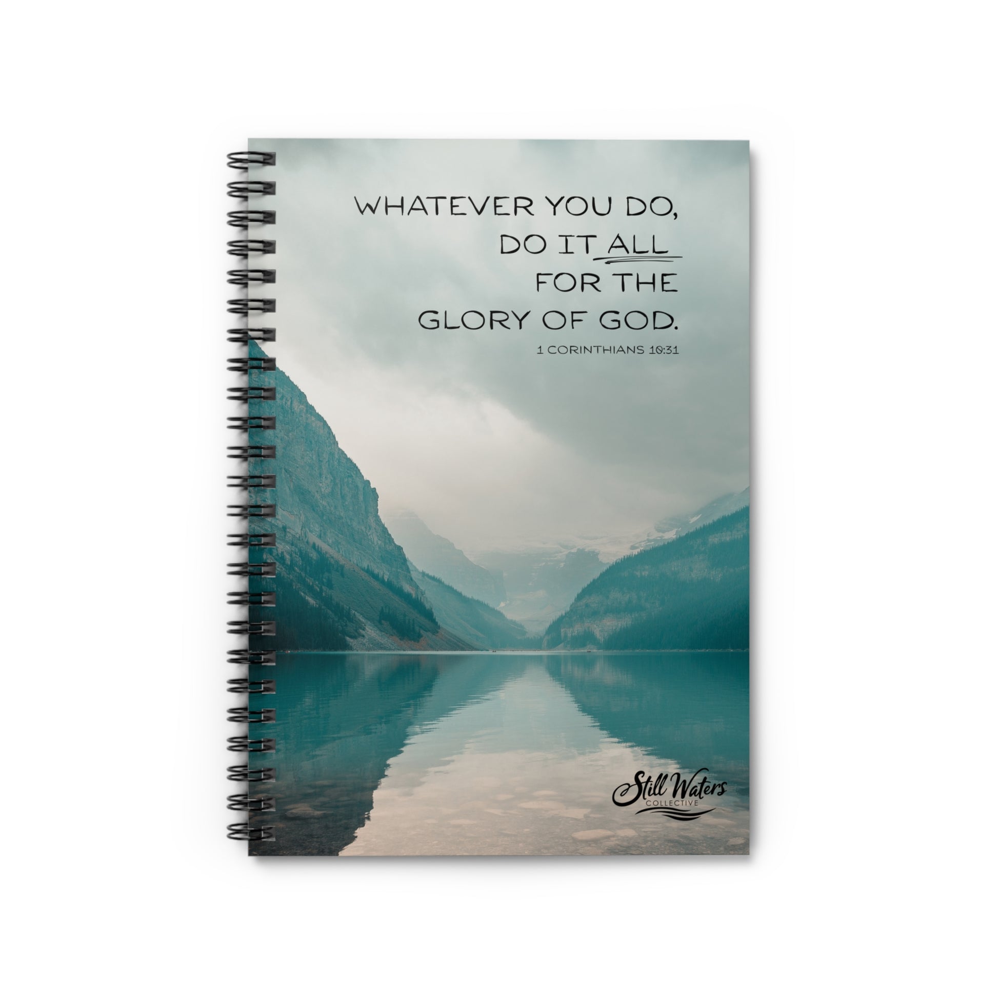 Find purpose and inspiration each time you write with this Still Waters Collective spiral journal, featuring the powerful words of 1 Corinthians 10:31: “Whatever you do, do it all for the glory of God.”
