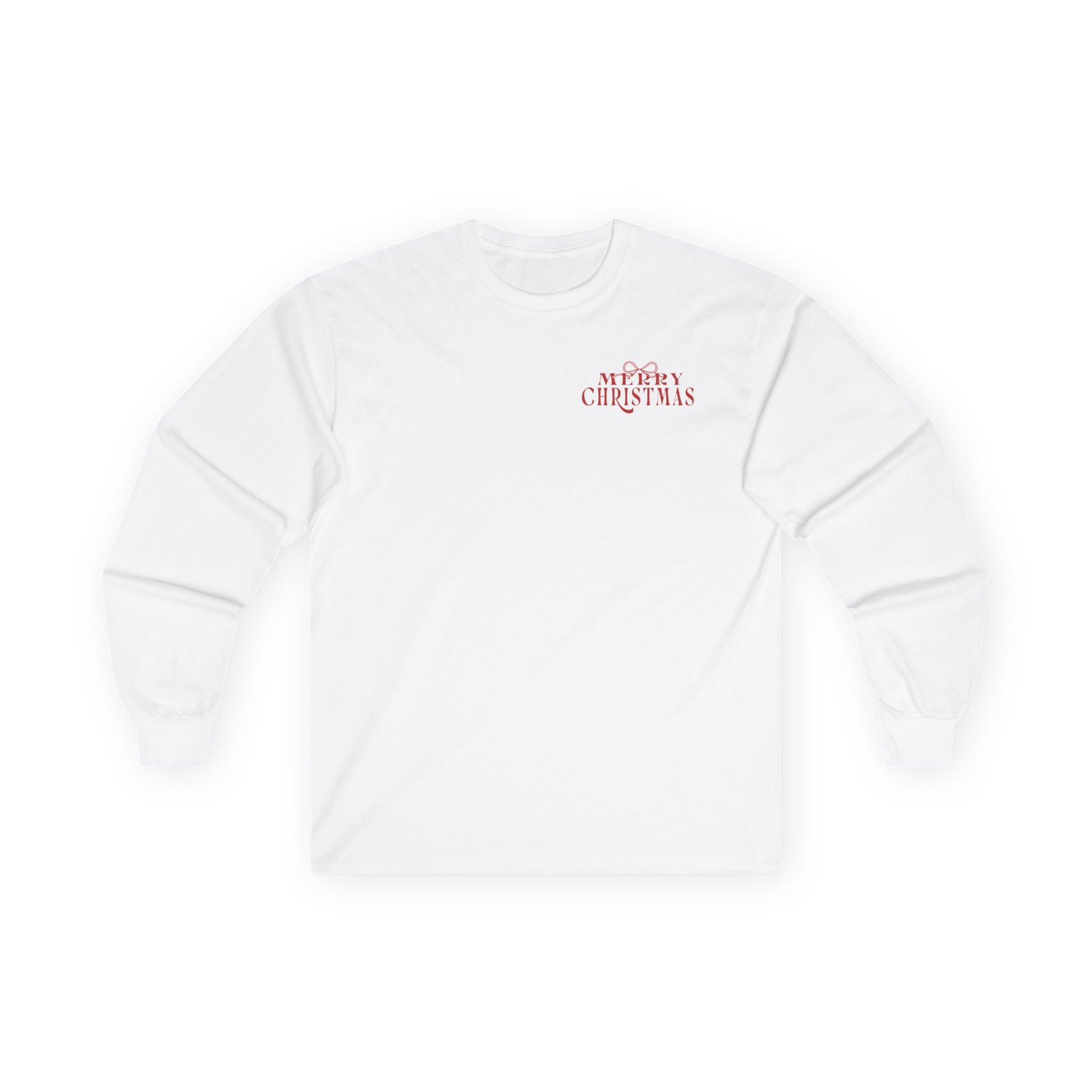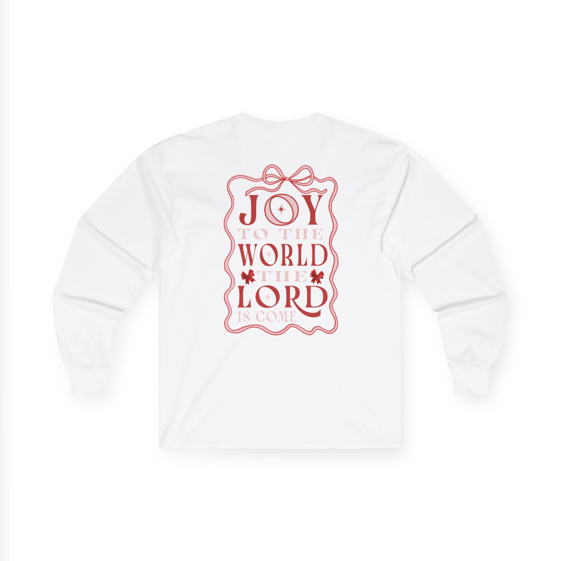 Celebrate the season with joy and faith in this festive long sleeve tee inspired by the timeless Christmas hymn. Featuring a delicate “Merry Christmas” print on the front and a bold “Joy to the World, the Lord is Come” design on the back, this shirt perfectly captures the heart of the holiday season.