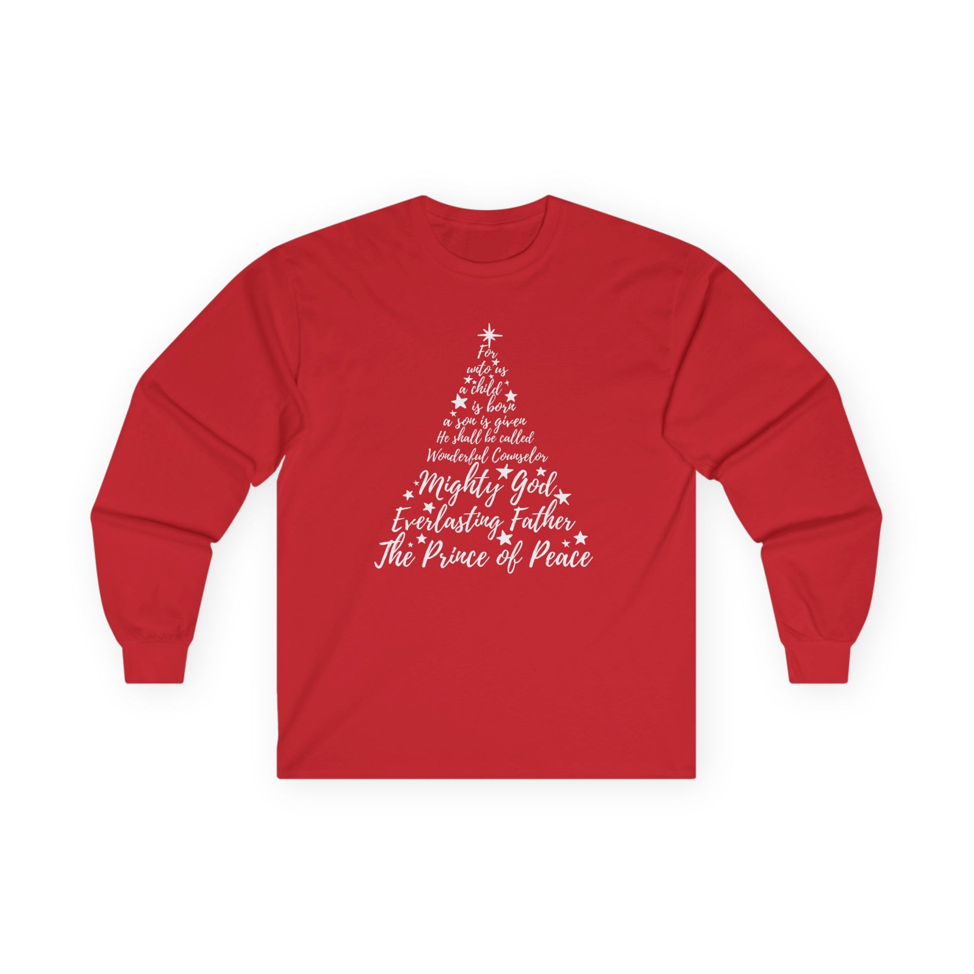 Celebrate the true meaning of Christmas with this elegant Prince of Peace long sleeve tee. Designed in the shape of a Christmas tree, the text beautifully displays the powerful prophecy from Isaiah 9:6: