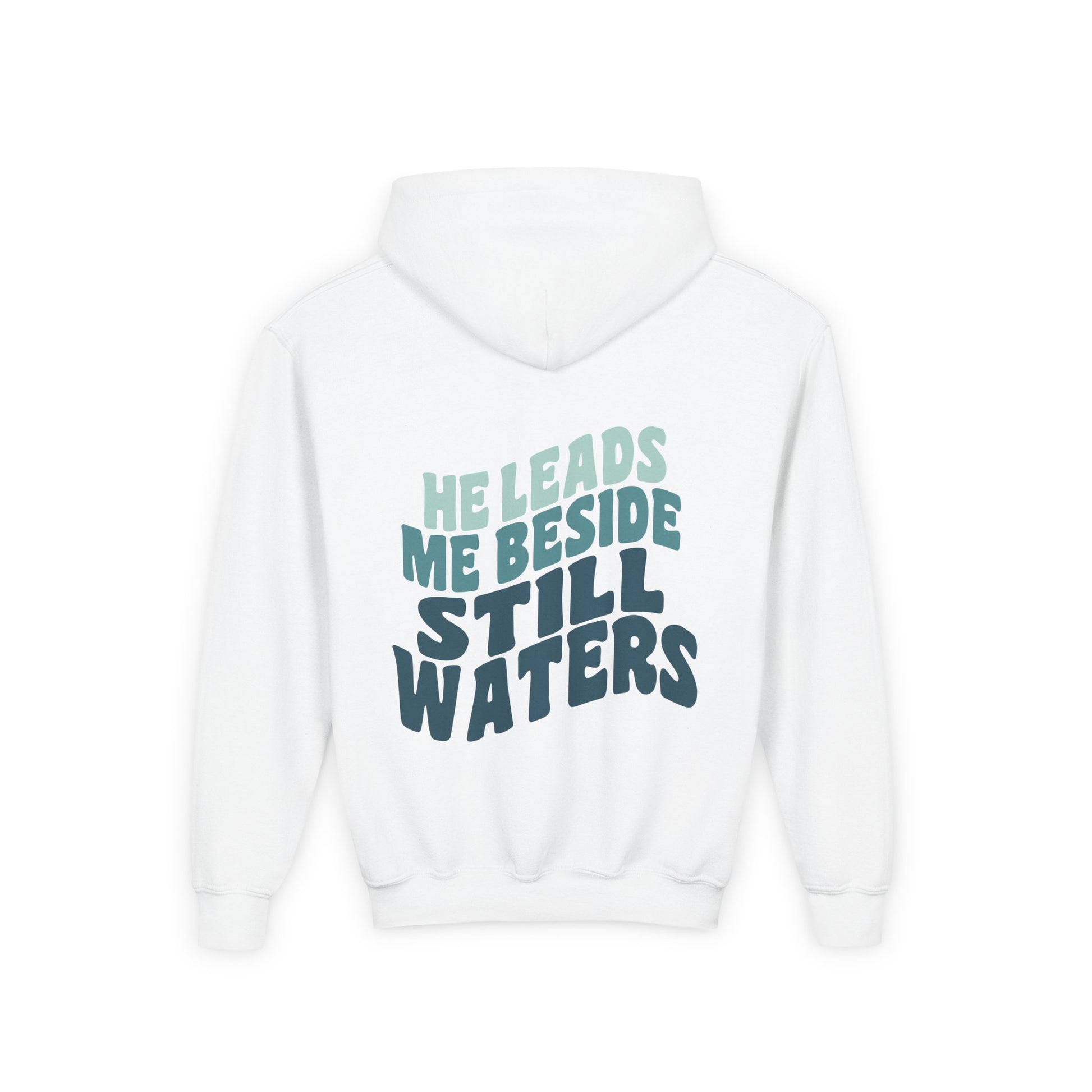 Let them wear comfort and confidence with the He Leads Me Youth Hoodie—where cozy meets groovy. Featuring a bold, retro-style back print that reads “He leads me beside still waters” and your original Still Waters logo on the front, this hoodie is a fun, faith-filled essential for kids who love to move, play, and express their light.